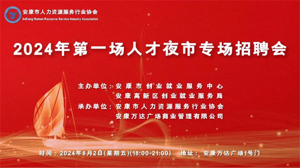 為有效保障企業(yè)用工需求,促進(jìn)未就業(yè)高校畢業(yè)生、退役軍人、城鎮(zhèn)失業(yè)人員、返鄉(xiāng)農(nóng)民工等各類人員就業(yè),安康市創(chuàng)業(yè)就業(yè)服務(wù)中心、安康高新區(qū)創(chuàng)業(yè)就業(yè)服務(wù)局定于2024年8月2日(星期五)在安康高新區(qū)萬達(dá)廣場1號門舉辦2024年第一場人才夜市專場招聘會,現(xiàn)將活動事項公告如下: