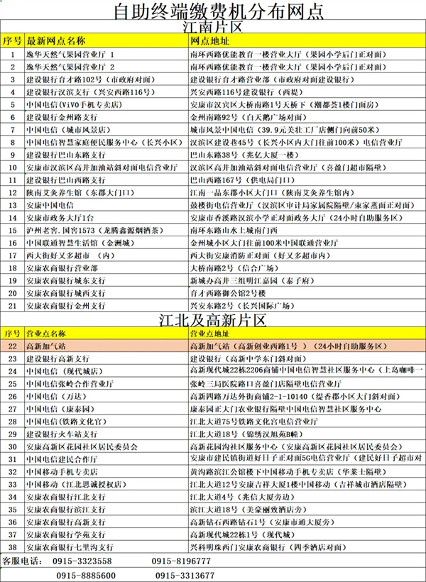 為進一步方便廣大用戶購買天然氣,我公司在電信營業(yè)廳、建設(shè)銀行、農(nóng)商銀行及便民服務(wù)點等網(wǎng)點布設(shè)38臺天然氣自助終端繳費機。現(xiàn)溫馨提示您關(guān)注“安康市逸華天然氣有限公司”微信公眾號查看自助機分布網(wǎng)點,選擇就近網(wǎng)點進行天然氣充值。其他業(yè)務(wù)可在工作時間內(nèi)前往以下人工服務(wù)大廳或窗口辦理,部分業(yè)務(wù)也可通過微信公眾號的“微營業(yè)廳”辦理: