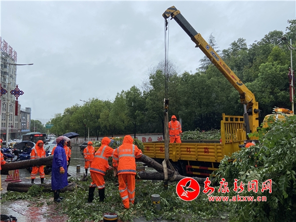 7月22日上午,位于黃溝路金城美墅小區(qū)門口,一棵碗口粗的大樹連根撥起,擋住了過往的車輛和行人,市政部門工作人員冒著大雨,正在清理。 (王國秀)RfC安康新聞網(wǎng)
