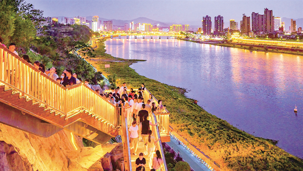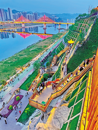 觀瀾亭飛檐斗拱,站在這里可西望月河匯漢江、東瞰碧水穿城過(guò);覽江云臺(tái)以鋼結(jié)構(gòu)懸挑凌空18.5米,形成“云端透視”觀江視角;花瀑疊翠垂直落差30米,杜鵑映崖、霧森彌漫,宛如仙境;望川臺(tái)將原始排水溝改造成“人工天成”的塑石景觀,周邊景色盡收眼底。