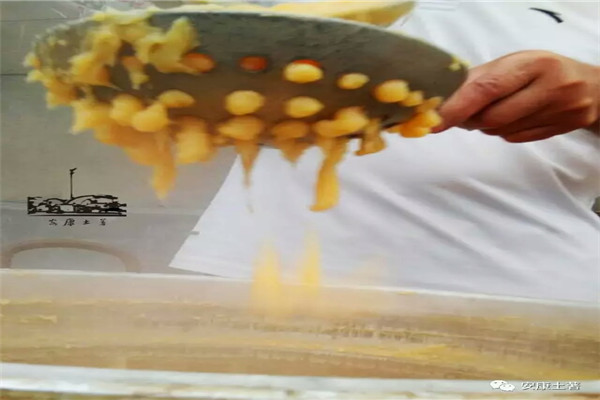 做面魚兒用的工具是漏勺,最早是用大葫蘆切兩半所做的葫蘆瓢,用燒紅的火鉆鉆出一個(gè)個(gè)的小洞,后來有了鋁制漏勺就很少有人再用葫蘆瓢了。