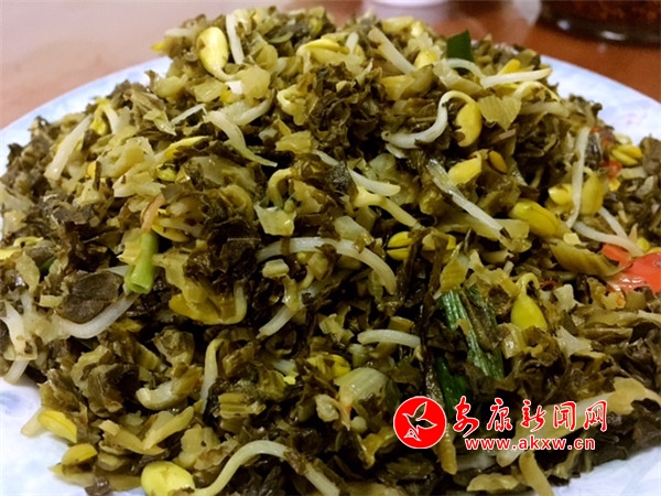 兩摻面摻好后醒的過(guò)程中,從酸菜壇子里撈出清亮的酸菜,配蒜瓣、姜末、蔥段、蒜苗、干辣子為佐料,韭菜、豆芽為輔料,一起下鍋炒熟,地道的安康酸菜出鍋,靜候與兩摻面的相逢。n2f安康新聞網(wǎng)